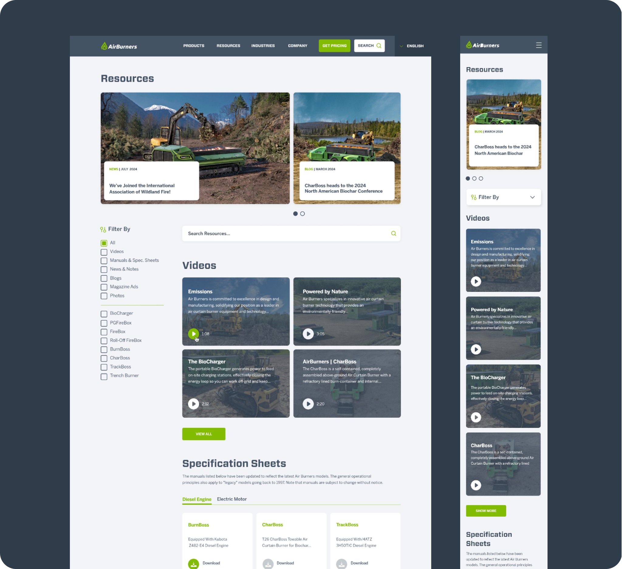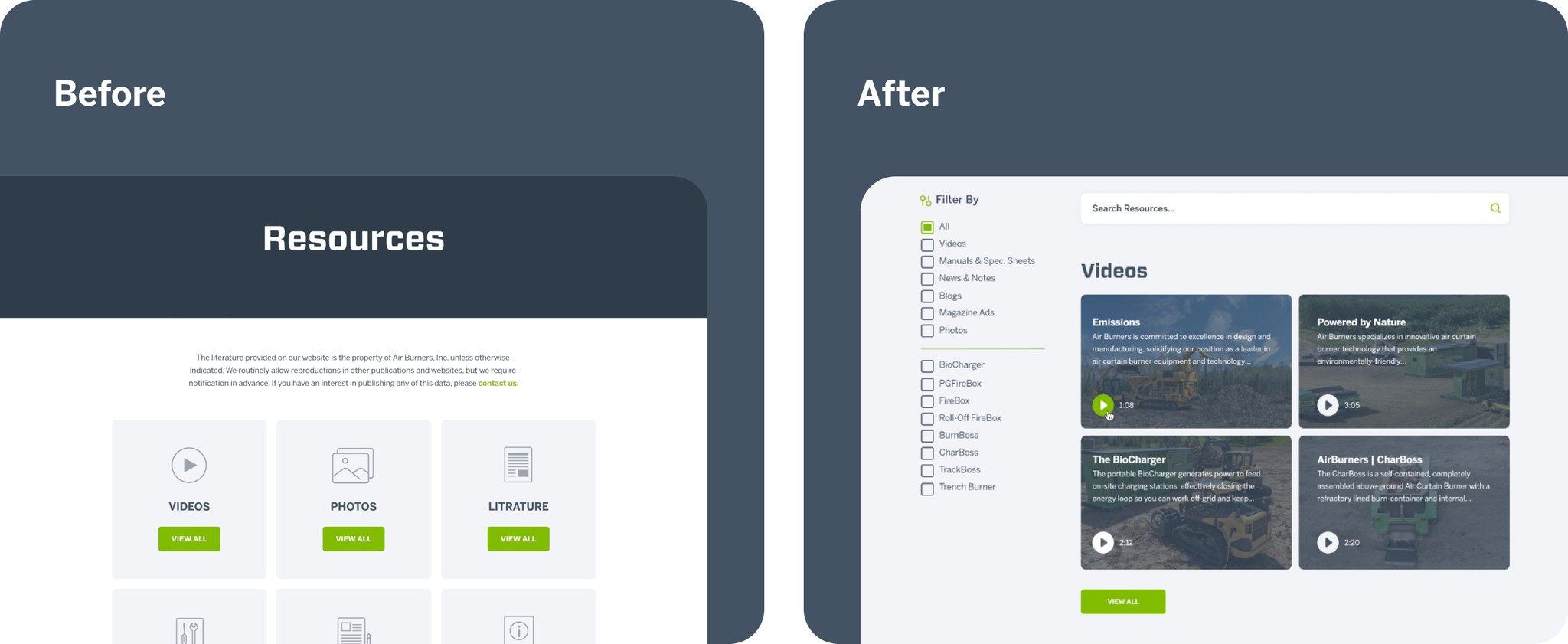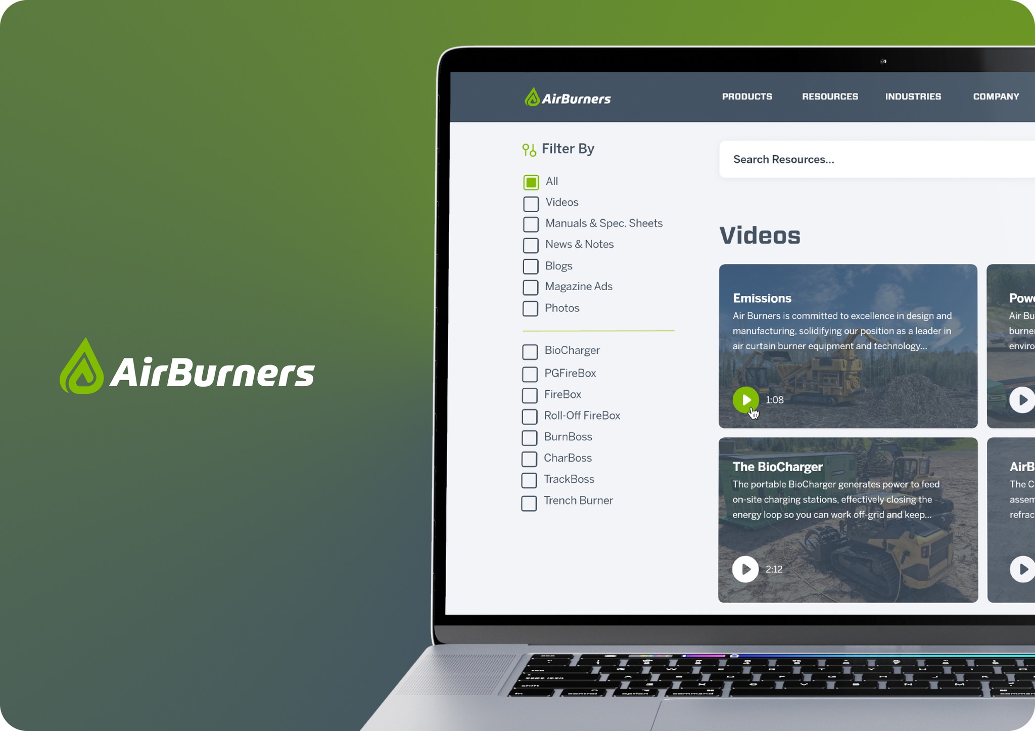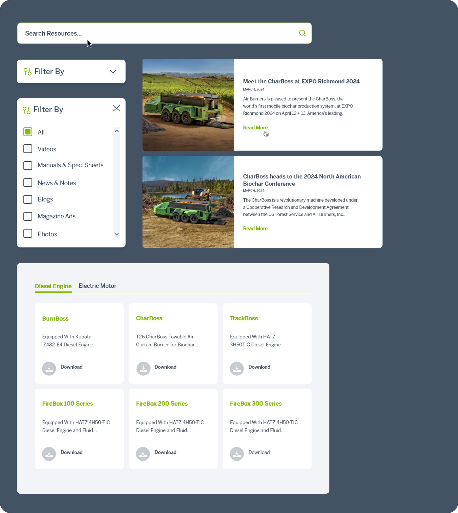 AirBurners products could be very difficult to differentiate to most users. The main goal was to improve AirBurners existing resources page by adding custom search results, being able to search by product and product type.